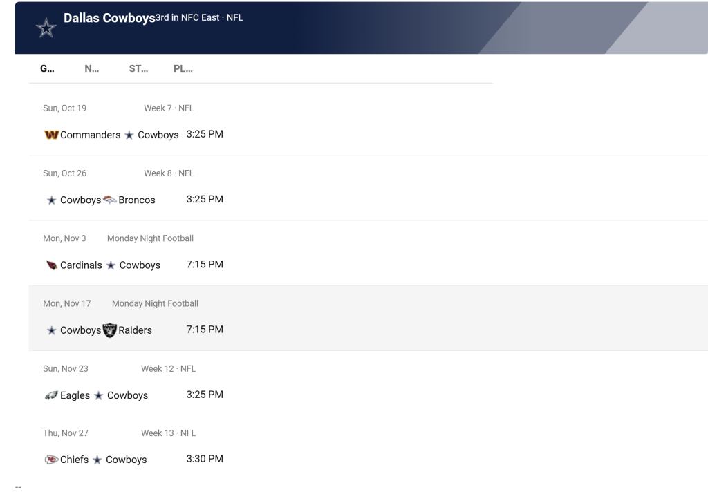 For more details Check this link: https://www.bing.com/sportsdetails?q=Washington%20Commanders%20vs%20Dallas%20Cowboys&gameid=SportRadar_Football_NFL_2025_Game_044b9610-460d-4698-a426-0688c382924f&league=Football_NFL&scenario=GameCenter&intent=Game&iscelebratedgame=False&sport=Football&TimezoneId=Central%20Standard%20Time&IANATimezoneId=America/Chicago&ISOTimezoneKey=CDT&seasonyear=2025&team=SportRadar_Football_NFL_2025_Team_e627eec7-bbae-4fa4-8e73-8e1d6bc5c060&team2=SportRadar_Football_NFL_2025_Team_22052ff7-c065-42ee-bc8f-c4691c50e624&venueid=%7B%22id%22:%22SportRadar_Football_NFL_2025_Venue_1e84213a-ff1f-4c9d-a003-8ee782b25a40%22%7D:version-1&segment=sports&isl2=true&