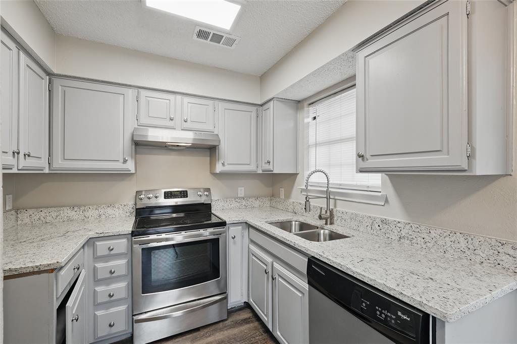 will love the spacious U-shaped kitchen with plenty of cabinets, gorgeous granite counter tops and recent appliances.